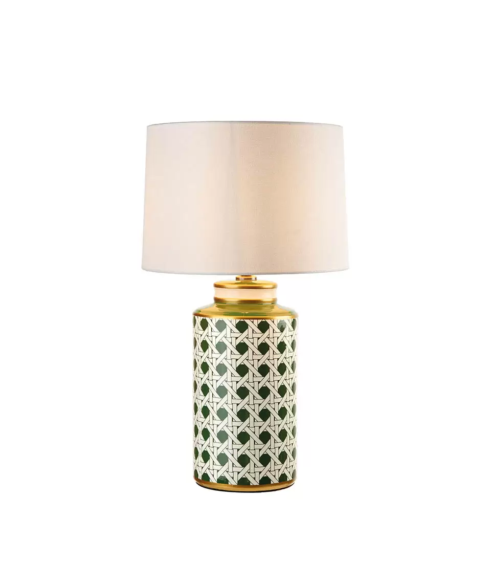 Lampada da tavolo in porcellana con paralume in tessuto. Una fantasia geometrica e preziosi dettagli dorati per un punto luce che cattura lo sguardo. Perfetta da abbinare alla giara d’ispirazione Ethno Chic con la stessa fantasia per un elegante angolo di design.
