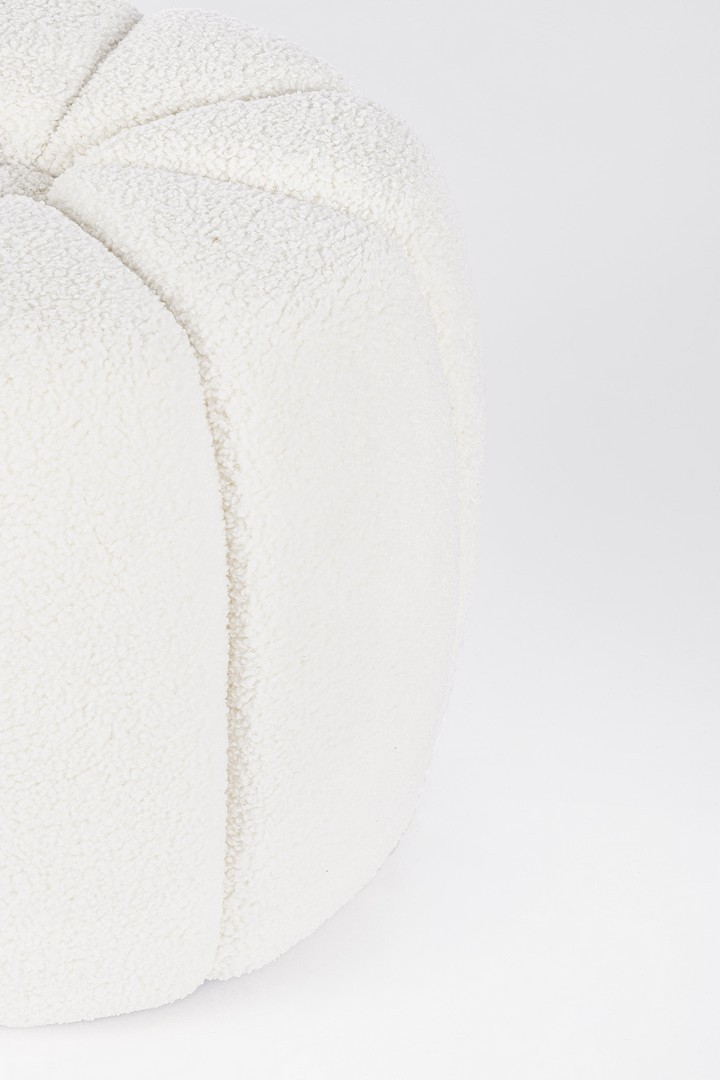 Pouf con struttura in mdf e compensato, rivestimento in poliestere effetto lana, densità imbottitura 30kg/m3 e con un anello decorativo inferiore in acciaio verniciato color oro.