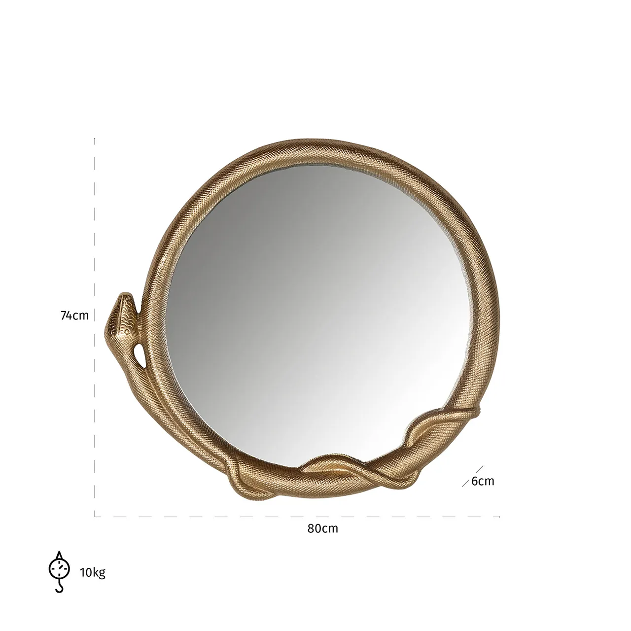 Specchio serpente con cornice color oro, realizzato in alluminio, specchio e un pannello rigido