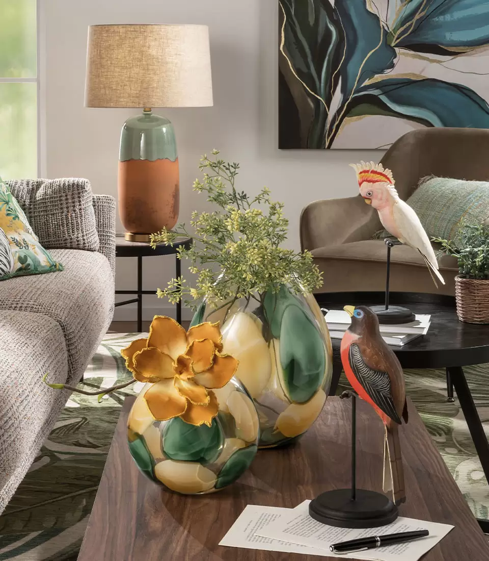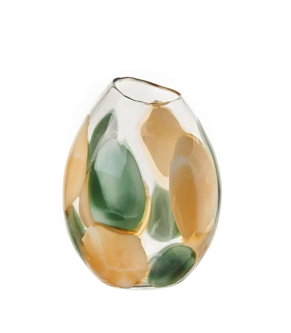 Vaso alto in vetro con allegro decoro in giallo e verde. Il complemento d’arredo perfetto per gli amanti dei colori. Abbinato al vaso basso dell’ispirazione Ethno Chic impreziosisce con eleganza la casa.