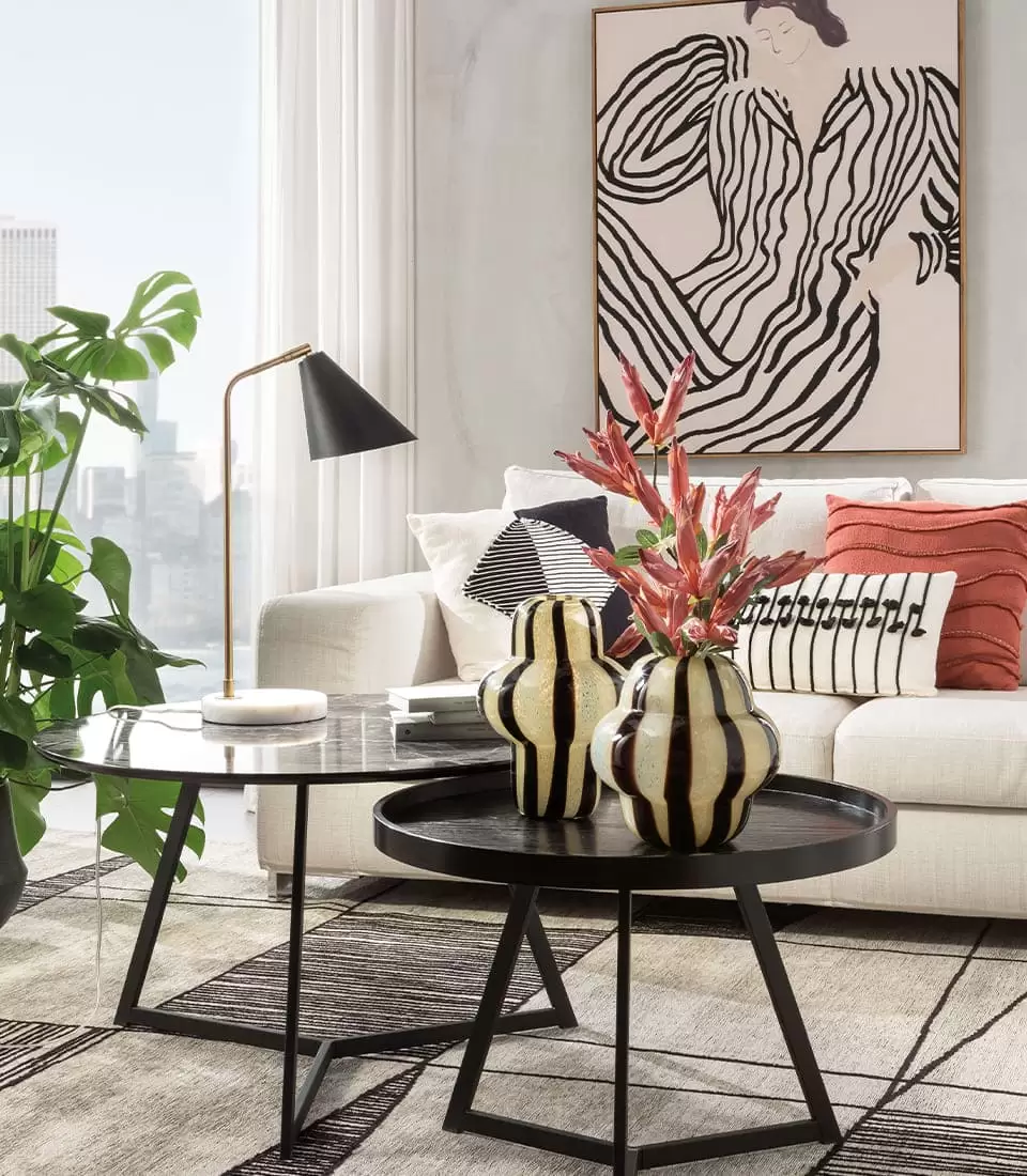 Vaso alto in vetro. Linee tondeggianti e un decoro bicolor verticale per un complemento d’arredo perfetto per gli amanti degli arredamenti minimal. Da abbinare al vaso basso coordinato dell’ispirazione Urban per una composizione moderna.